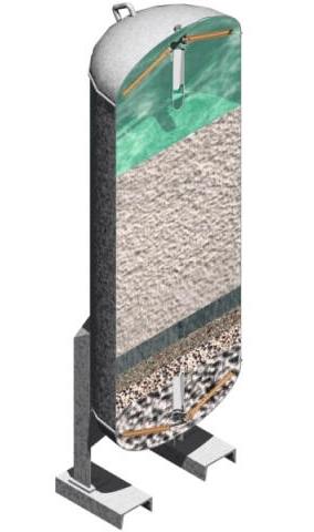 it consists of range of sand or media of different sizes from fine to coarse and on passing water through the filter sediments and other particles are blocked and filtered water passes through other end of the vessel for further use or filtration level.
